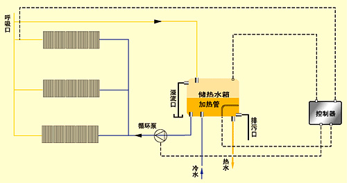 工作原理:在光照條件下將太陽能集熱器采集的熱量儲存并加熱水(或其他介質)使之溫度升高,再將含有高能量的水或介質送入儲熱容器內(水箱)。光照不足或無光照條件下用常規能源補償。