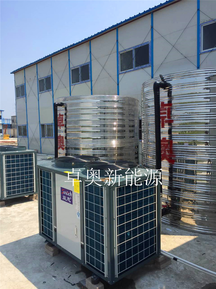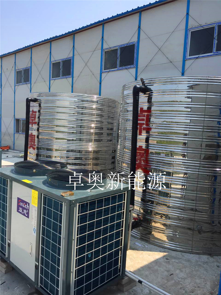 系統配置:2臺15匹商用空氣能+2個圓形不銹鋼保溫水箱