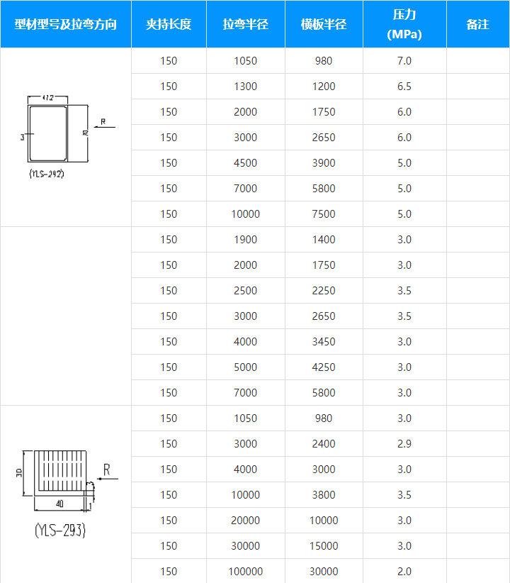 根據加工件的彎弧半徑,合理地選取模板(有時要用靠弧板選定)并要用編織布將模板均勻包一層,以防型材表面在加工過程中被劃傷。(模板彎弧半徑Rm=KR工件 K=0.5-0.95 K值根據工件的半徑、斷面大小 、材料的機械性能來選取)(注:最小拉彎半徑為1米)